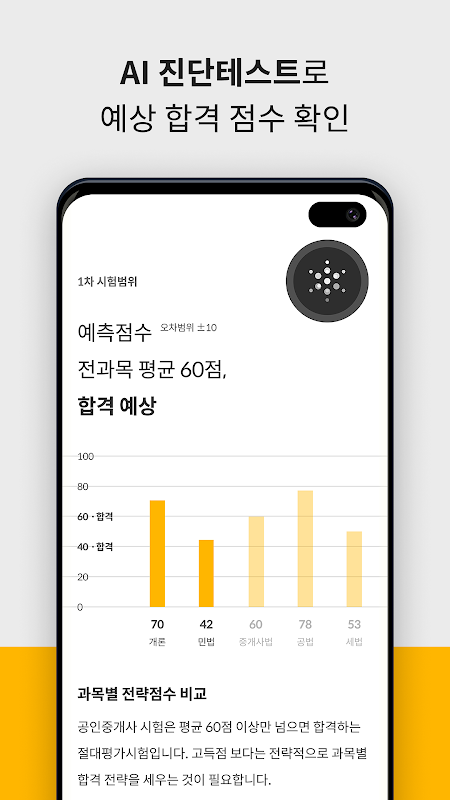 각 과목별 점수 예측과 실제 시험에서 합격 점수를 달성하도록 맞춤형 학습 커리큘럼 제공!