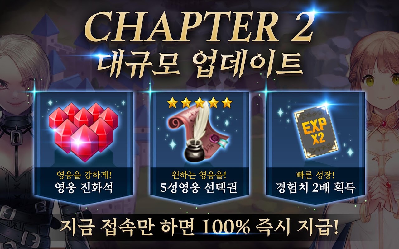 - 5성 영웅 선택권 1장 / 4성 영웅 모집권 1장 / 100,000 골드 / 다이아 1,000개