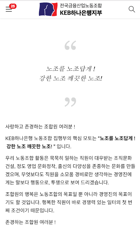 KEB하나은행 노동조합 집행부의 핵심 모토는 “노조를 노조답게 ! 강한 노조 깨끗한 노조! ” 입니다.