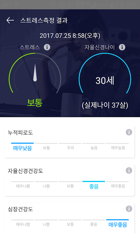 - 신체(자율신경)나이, 스트레스, 누적피로도, 심장건강도,