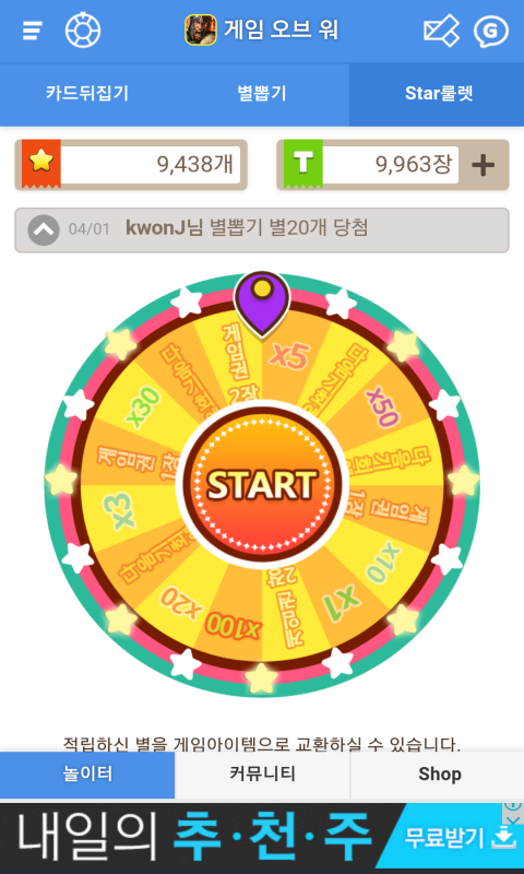 1.매일 접속시 메인화면 무료 일일룰렛에 참여하여 별 및 게임권을 획득하세요.
