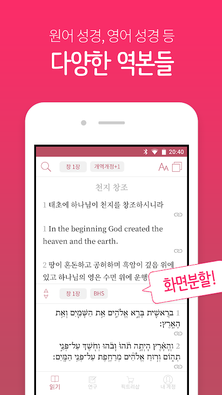 আপনি একসাথে এক পর্দায় অনুবাদের পড়া পছন্দ যে কোন সংখ্যার হতে পারে। হাঙ্গুল বাইবেল এবং বাইবেল, হিব্রু ও গ্রিক সংস্করণের সাথে বিপরীত চেষ্টা করুন। এবং এছাড়াও চেষ্টা ডুয়াল মোড ক্ষমতা দুটি পর্দা বিভাজক দ্বারা পাওয়া সুবিধা নেওয়ার জন্য।