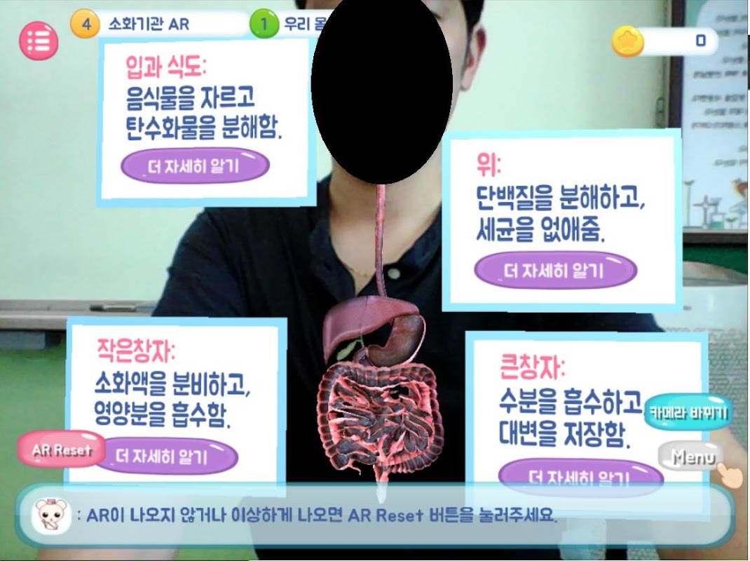 4. AR(증강현실)로 배우기 : 우리 몸과 교과서(붙임딱지)에 설정된 AR을 통해 우리 우리 소화기관을 깊이 있게 학습 할 수 있다.