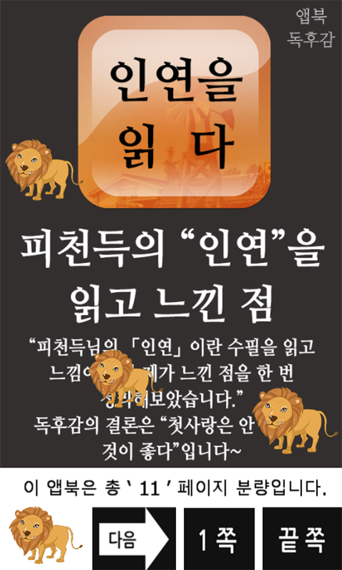 ◈ 앱의 줄거리 : “피천득님의 「인연」이란 수필을 읽고 느낌이 좋아 제가 느낀 점을 한 번 정리해보았습니다.” 제 독후감의 결론은 “첫사랑은 안 만나는 것이 좋다”입니다~