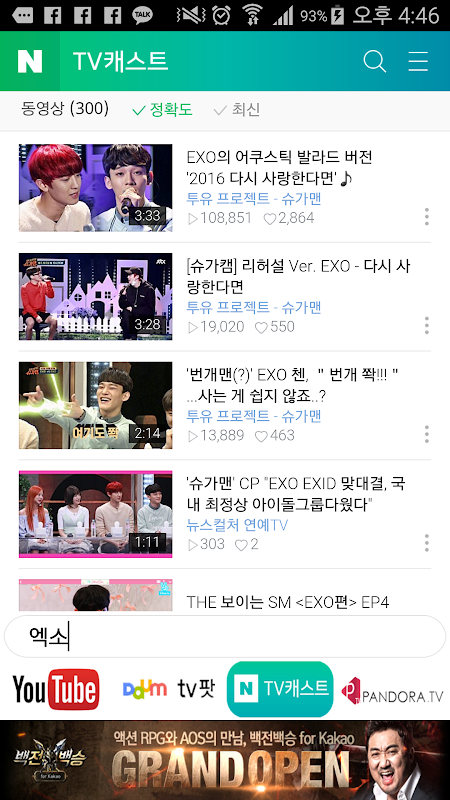 Naver TV, then pot, Pandora TV, a YouTube video search with a single application.