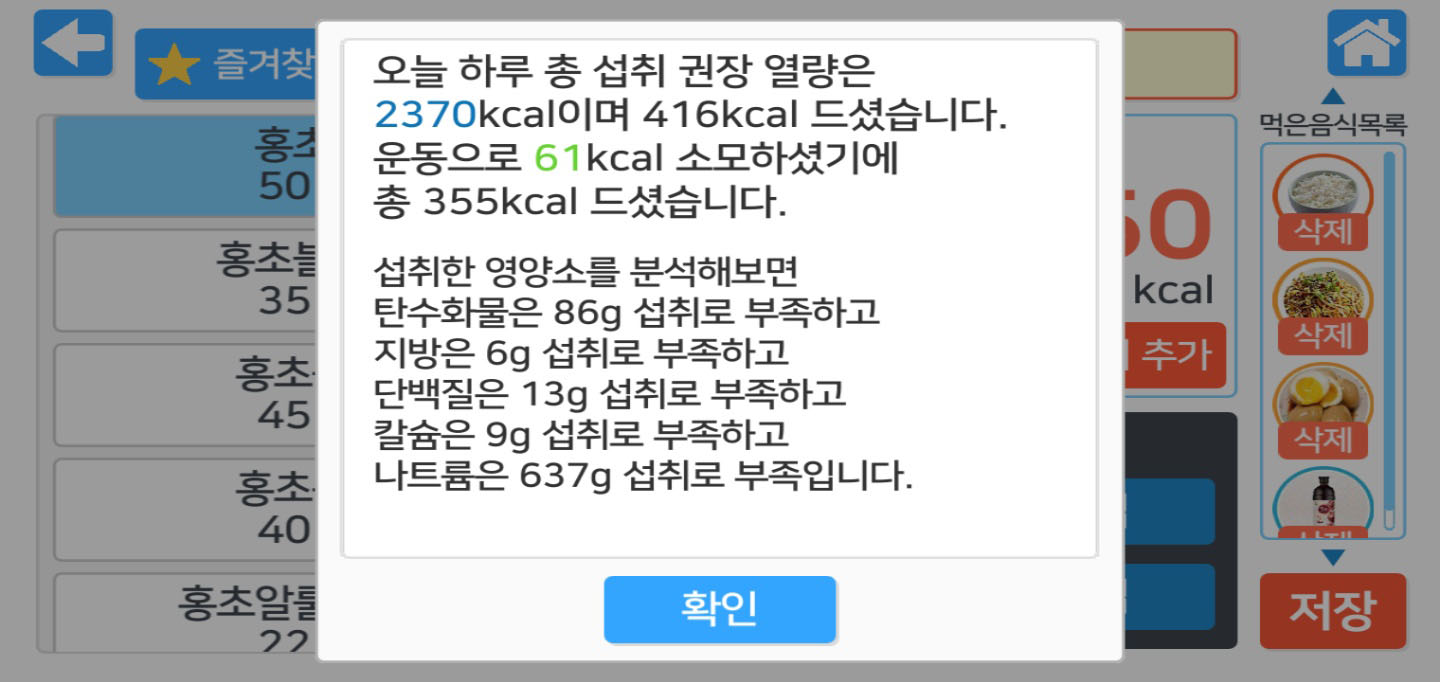 * 음식 섭취 성분, 운동 상태, 건강 상태 그래프 도식화