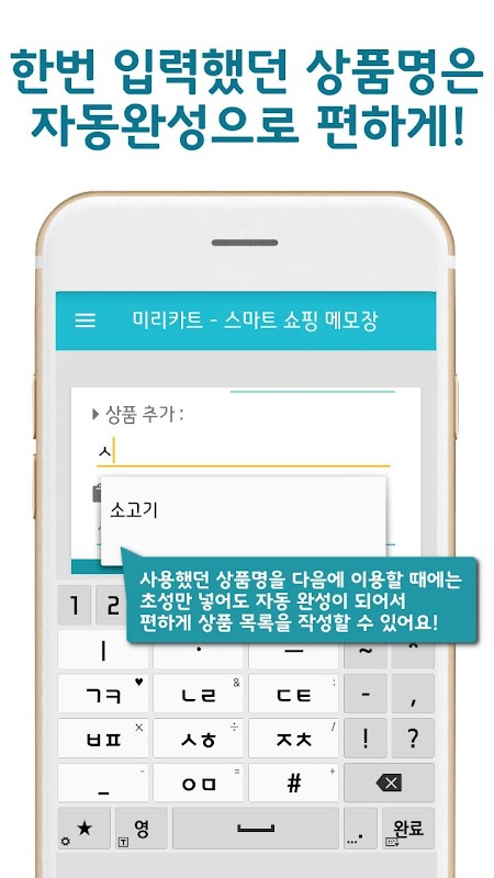 그리고 본 장보기 메모장 앱에서는 입력한 상품명을 기억하는 기능과 함께 이를 바탕으로 한글의 초성 입력완성 기능, 한글 약어 입력완성 기능, 한글 단어 자동완성 기능 등 한글에 최적화된 편리한 입력 시스템을 제공하고 있습니다.