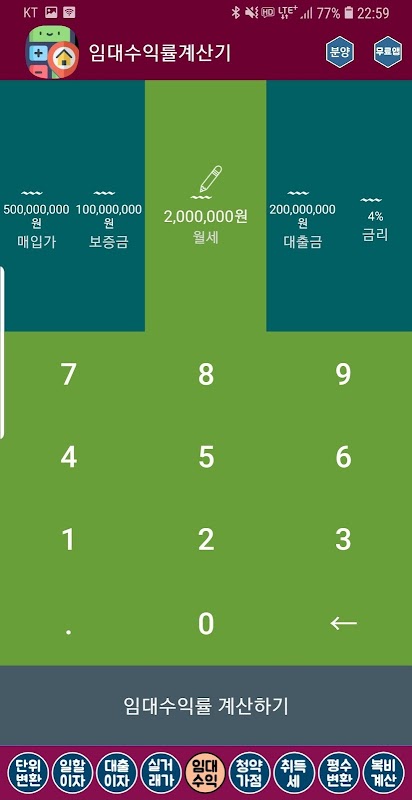 부동산계산기 (청약가점 복비 대출이자 임대수익률 연비) 2.22