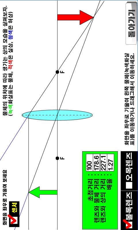 - 렌즈작도 실험 : 볼록 렌즈 작도 실험의 경우에 물체의 위치에 따라 상이 생기는 실험을 수행할 때 가상실험 어플을 이용하여 렌즈와 물체를 어떤 곳에 놓으면, 어떤 곳에 상이 어떤 모습으로 생길지 예측할 수 있고, 실제실험과 비교해 가면서 실험을 수행할 수 있음