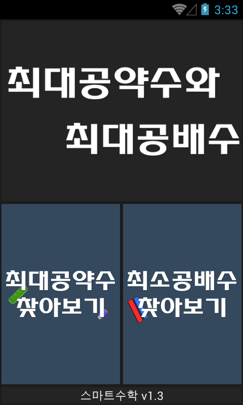 원리탐구에 중점을 둔 어플로 최대공약수 학습시에 공약수끼리 곱하면 왜 최대공약수가 나오는지 이해할 수 있게 구성하였습니다.