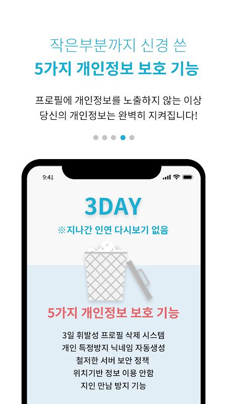 3일 휘발성 프로필 : 매칭 사이클(3일)이 끝나고 최종 매칭이 완료된 후, 매칭이 성사되지 않았다면 당신의 프로필은 상대 이성에게 완전히 사라져 보여지지 않습니다.