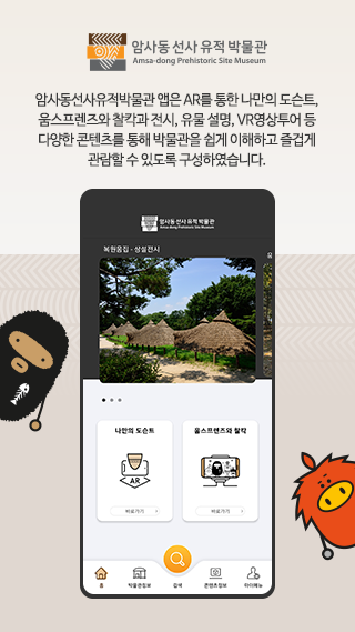 - আপনি ভিআর ভিডিও ট্যুরের মাধ্যমে আমসা-ডং প্রাগৈতিহাসিক যাদুঘরের চারপাশে দেখতে পারেন, উচ্চ-রেজোলিউশন চিত্রগুলির মাধ্যমে আমসা মিউজিয়ামে মৃৎশিল্পগুলি বিশদভাবে দেখতে পারেন এবং এআর-এর মাধ্যমে বাড়িতে নিদর্শনগুলি দেখতে পারেন৷
