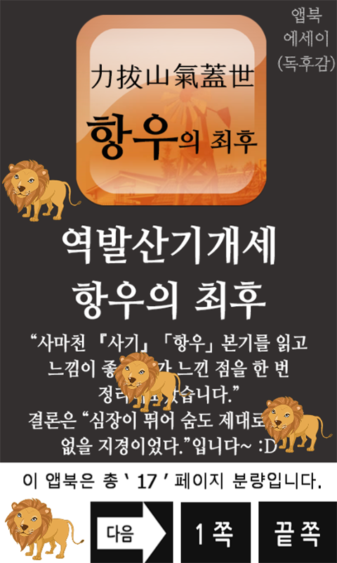◈ 앱의 줄거리 : “사마천 『사기』 「항우」본기를 읽고 느낌이 좋아 제가 느낀 점을 한 번 정리해보았습니다.” 에세이(독후감)의 결론은 “책을 다 읽고 나서는 심장이 뛰어 숨도 제대로 쉴 수 없을 지경이었다.”입니다~ :D