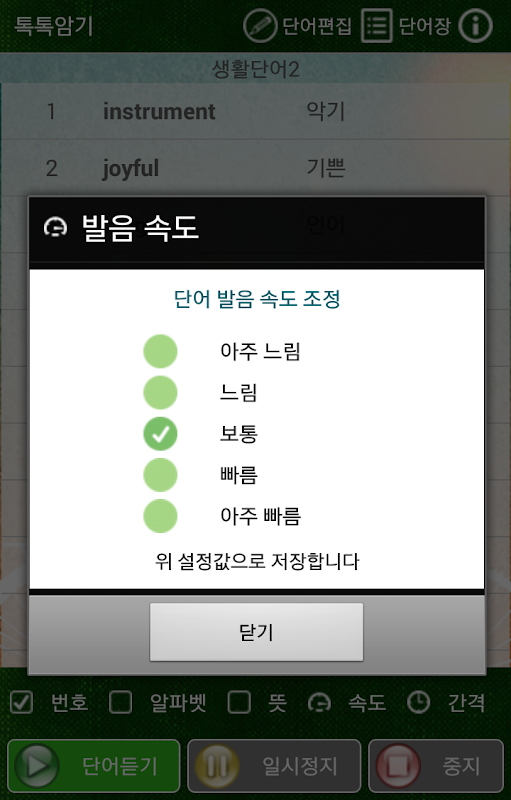 알파벳 단위로 발음하고, 한글 뜻을 발음하도록 선택할 수 있고, 영어 발음 속도와 발음 단어 사이 시간 간격을 조정할 수 있습니다.