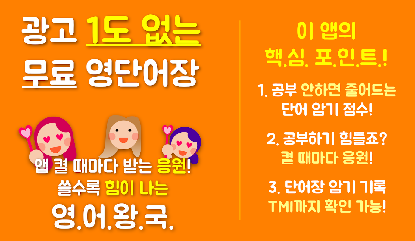 영단어 공부하기 힘들죠? 앱을 켤 때마다 받는 응원! 쓸수록 힘이 나는 영어 단어장인 영어왕국에 와 주세요!