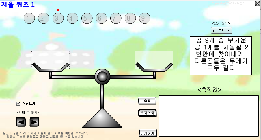 위에 나타난 공을 드래그 해서 윗접시 저울 위에 사각형 영역에 끌어다 놓고 측정 버튼을 누르면 측정이 된다. 초기위치는 공들을 원래 위치로 보내는 버튼이고, 다시하기는 처음부터 다시하는 버튼이다. 다시하기를 눌러도 정답 공의 위치는 바뀌지 않는다.