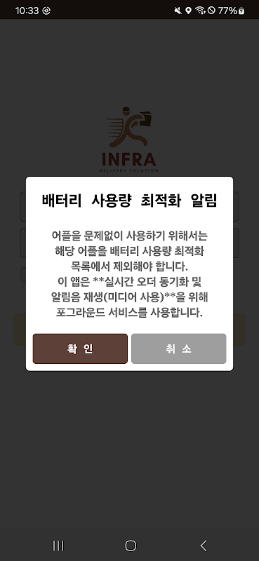এই অ্যাপটি ফোরগ্রাউন্ড পরিষেবা ব্যবহার করে রিয়েল-টাইম অর্ডার পেতে এবং অবিলম্বে বিজ্ঞপ্তিগুলি প্রদান করে। এই ফাংশনটি অ্যাপের একটি মূল ফাংশন, এবং অ্যাপটি চালু হলে স্বয়ংক্রিয়ভাবে সক্রিয় হয় এবং নিম্নলিখিত ক্রিয়াগুলি সম্পাদন করে: