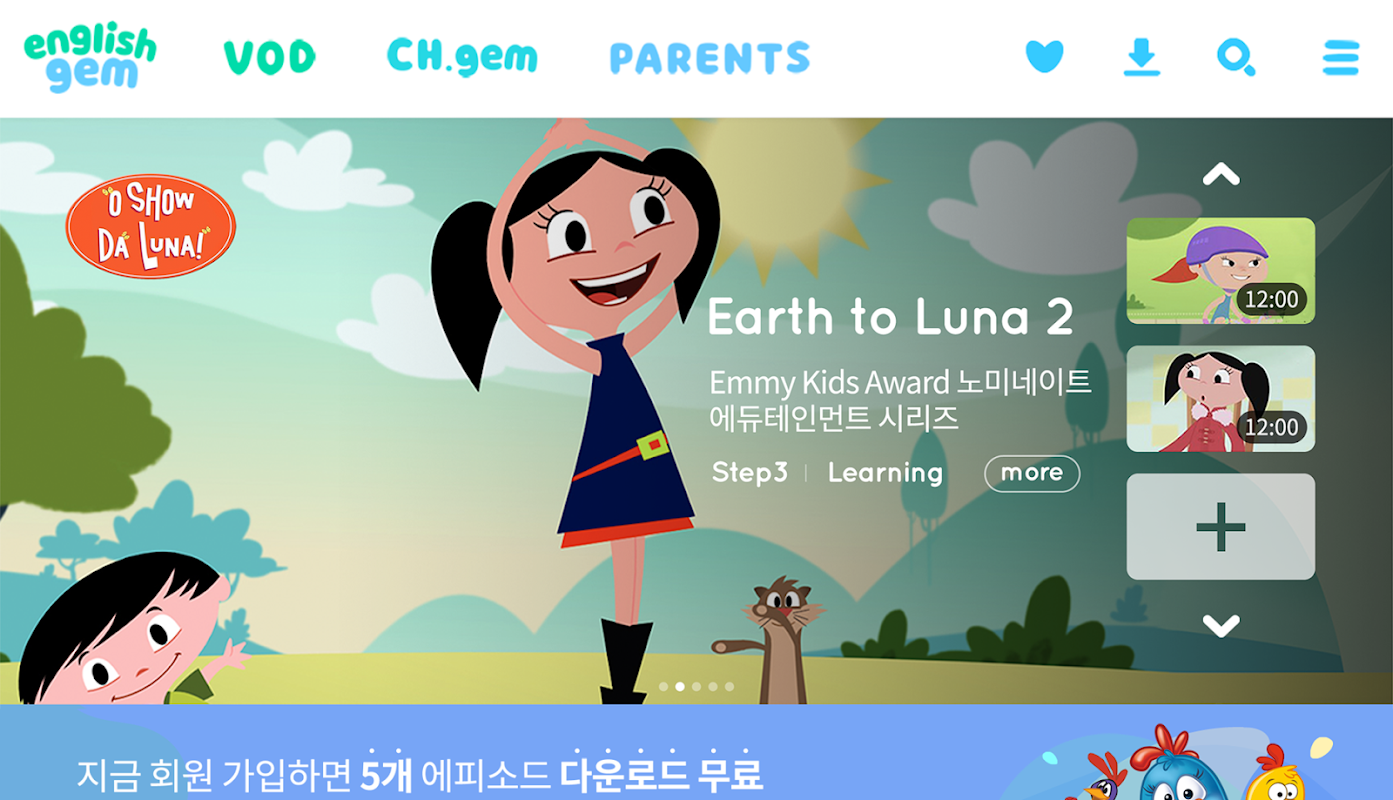 PBS KIDS, BBC Cbeebies 등 영미권 대표 방송 콘텐츠, 세계적으로 검증받은 해외 수상장&후보작, 현지 동시 방영에 가까운 최신 콘텐츠가 가득! 재미있게 보고 듣기만 해도 우리 아이 영어 실력이 쑥쑥 자라납니다! 비싼 DVD로 사봐야 했던, 유학생들이 보고 자랐다는 그 영어 프로그램들 모두 '잉글리시 젬'에서 무제한으로 이용하세요!
