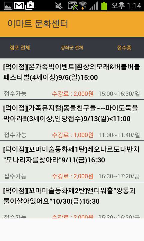 ই-মার্ট কালচারাল সেন্টার, হোমপ্লাস কালচারাল সেন্টার, লোটে ডিপার্টমেন্ট স্টোর কালচারাল সেন্টার, হুন্ডাই ডিপার্টমেন্ট স্টোর কালচারাল সেন্টার, এনসি ডিপার্টমেন্ট স্টোর কালচারাল সেন্টারের তথ্য এক নজরে দেখা যাবে।