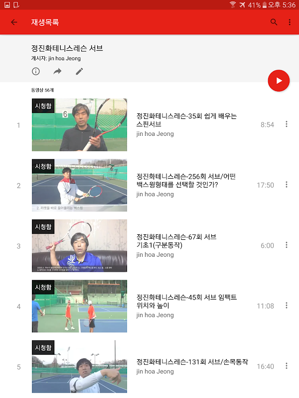 প্রযুক্তি টেনিস পাঠ এবং টেনিস উত্সাহীদের দ্বারা Jeongjinhwa YouTube প্লেলিস্ট এবং সাজান সহজে ব্যবহারের জন্য ভিডিও তৈরি করা হয়েছে.