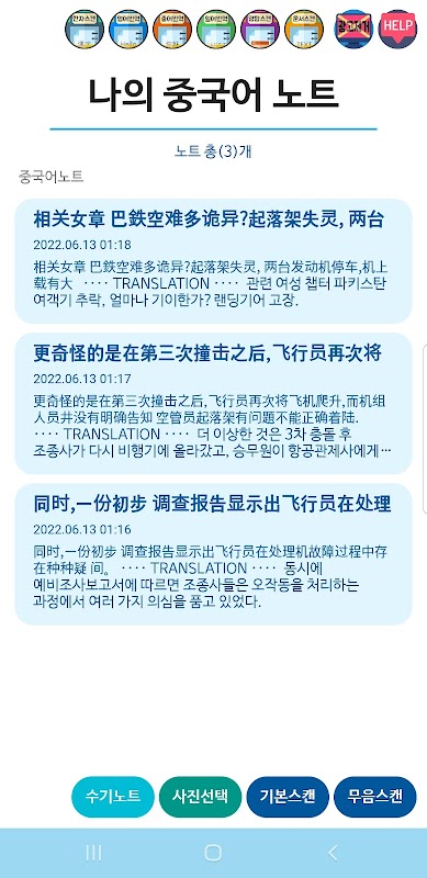 - 중국어를 스캔하여 손쉽게 노트해 보세요! 사진을 불러오거나 사진을 촬영한 후 중국어 영역을 선택하면 자동으로 번역하여 저장합니다.