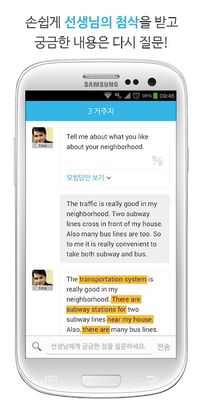 단원을 선택하고 질문에 답을 해보세요. 영어 선생님이 올바른 표현으로 고쳐드립니다. 이제 스마트폰으로 간편하게 영어 선생님과 공부할 수 있습니다.