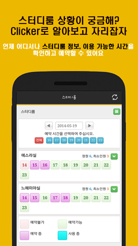 Clicker는 전자도서관 전체 시설관리를 위한 시스템 (Smart Library Management System) 으로서 Kiosk, PC, Tablet, Smart Phone등 모든 기기를 이용해 동일한 인터페이스로 열람좌석, 세미나룸, 멀티미디어룸, 사물함 등의 시설을 이용자와 연결해 주는 시스템 입니다.