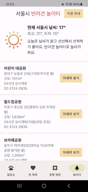 Information sources: Seoul Animal Welfare Support Center (animal.seoul.go.kr), local administrative license data openness (localdata.go.kr), Korea Meteorological Administration (weather.go.kr)