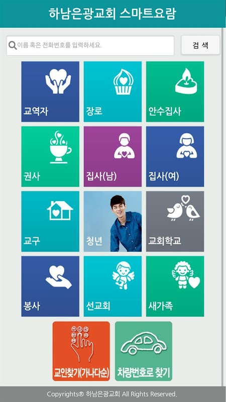 교역자, 장로, 권사, 집사 및 구역장(목자), 교사 등 모든 성도들의 요람을 스마트폰에서 확인하실 수 있는 스마트폰용 어플리케이션입니다.
