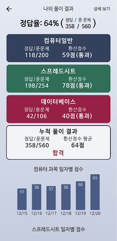 4) 풀이 통계 & 취약점 분석: 풀이 기록과 주제별 정답률을 한눈에 볼 수 있는 통계 그래프를 통해 취약점 파악 & 집중 공략