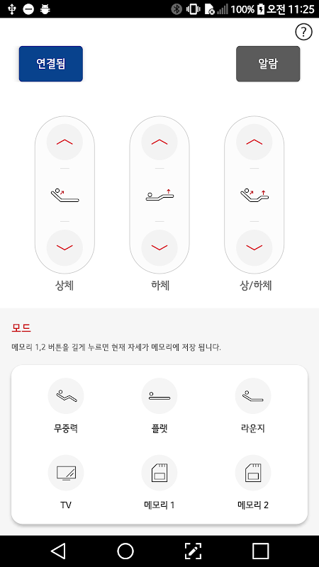간편한 동작으로 한샘 바흐 801 모션베드를 움직여 보세요. 모션베드 주위에서 스마트폰의 블루투스 연결을 통해 침대를 쉽게 움직일 수 있습니다. 최초 연결된 기기는 저장되어 이후 앱 실행 시 해당 기기를 자동으로 연결할 수 있습니다. 요일별 반복 알람을 지정해서 원하는 요일에 나만의 메모리 자세로 상쾌하게 기상할 수 있습니다.