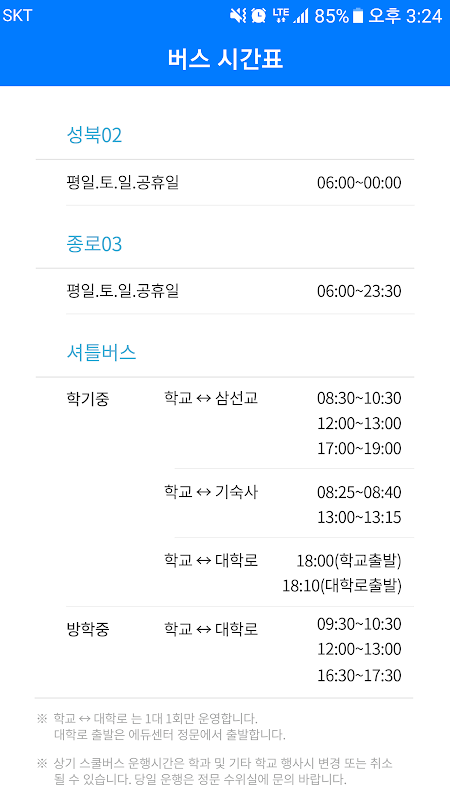 *상기 스쿨버스 운행시간은 학과 및 기타 학교 행사 시 변경 또는 취소 될 수 있습니다. 당일 운행은 정문 수위실에 문의 바랍니다.