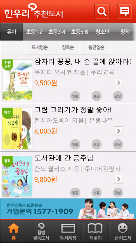 한우리추천도서앱은 유아, 초등, 중등, 고등 연령별 도서 정보를 제공합니다. 한우리가 추천하는 좋은책을 만나보세요.