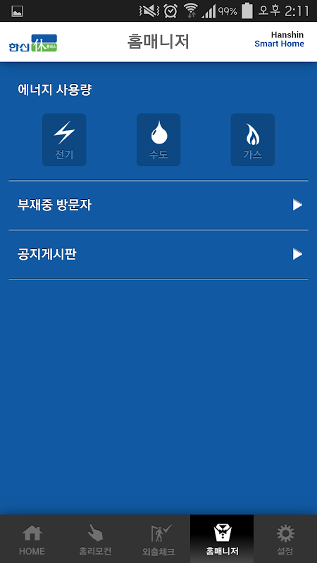 기본적인 서비스로 조명, 난방, 가스, 환기 제어가 있고 공지사항, 부재중 방문자 등을 제공합니다.
