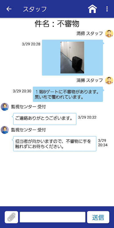このアプリでは、各種施設やイベント等において、安全と安心を守るため、スタッフ等関係者の位置情報を用いた通報等の情報共有を行えます。