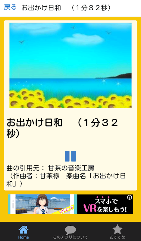 30秒ぐらいの短い曲もあれば、2分あまりある長めの曲もあります。ホーム画面から好みの曲