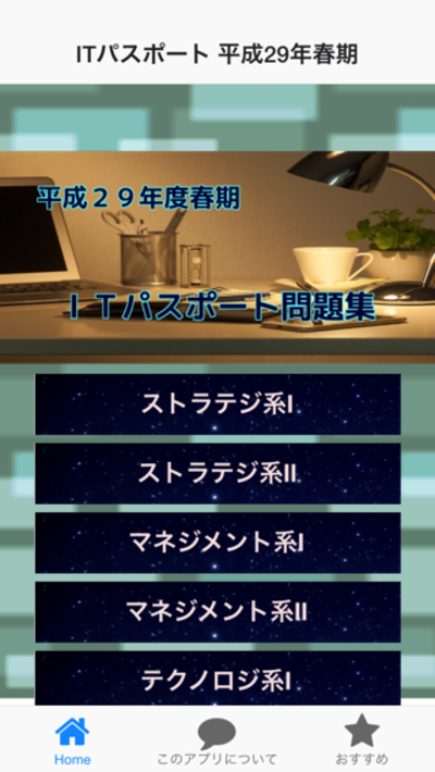 国家試験の「ITパスポート」の平成29年春期試験問題からの抜粋版です。設問数をあえて減らすことで、ちょっとした通勤通学などの隙間を活用して手軽に学習できます。