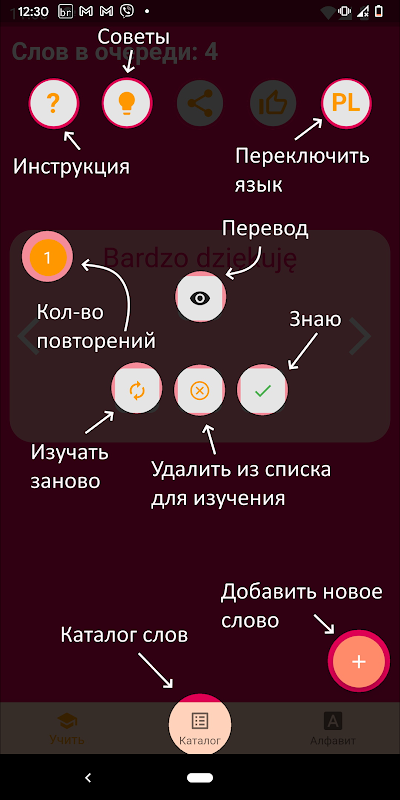 অ্যাপ্লিকেশনটিতে কেবল অধ্যয়ন করা শব্দগুলিই নয়, অন্য যে কোনও ভাষার শব্দগুলিও মুখস্থ করার জন্য বেশ কয়েকটি দরকারী টিপস এবং সুপারিশ রয়েছে। ব্যবহারের এক মাসে, আপনি মৌলিক পোলিশ শব্দ শিখতে পারবেন।