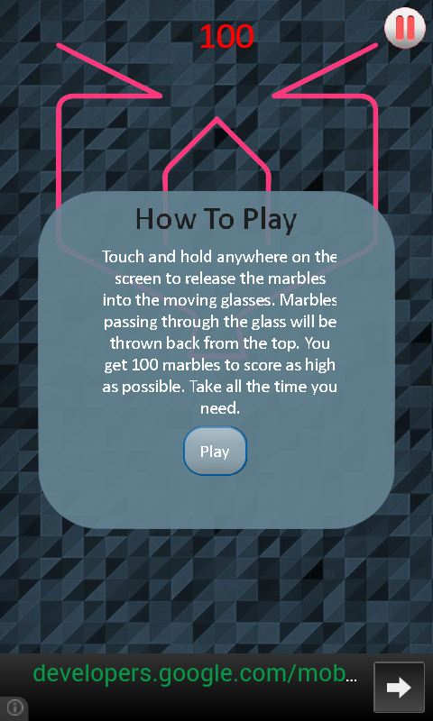 The goal of the game is to fill moving cups with falling marbles by opening the gate of the pot by touching on the screen. For each marble you manage to get through the glass you're rewarded with a different amount of points, depending on its color. If the marbles misses the glass, it disappears.