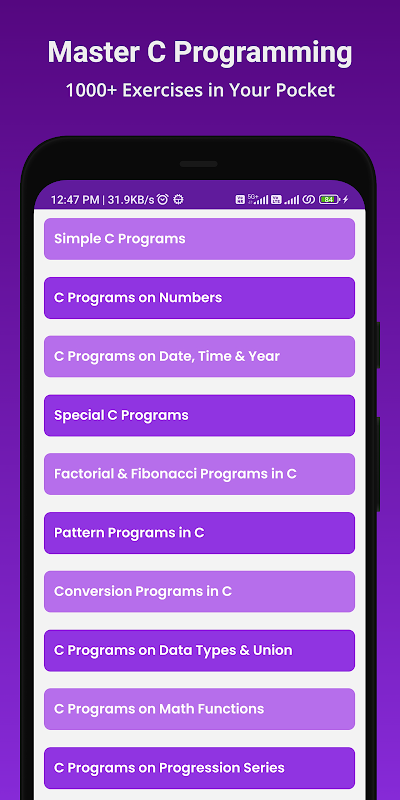 সি প্রোগ্রামিং অ্যাপ: 1000+ উদাহরণ, সমাধান করুন, ব্যাখ্যা করুন, যে কোনো সময়ে, যেকোনো জায়গায় জয় করুন।