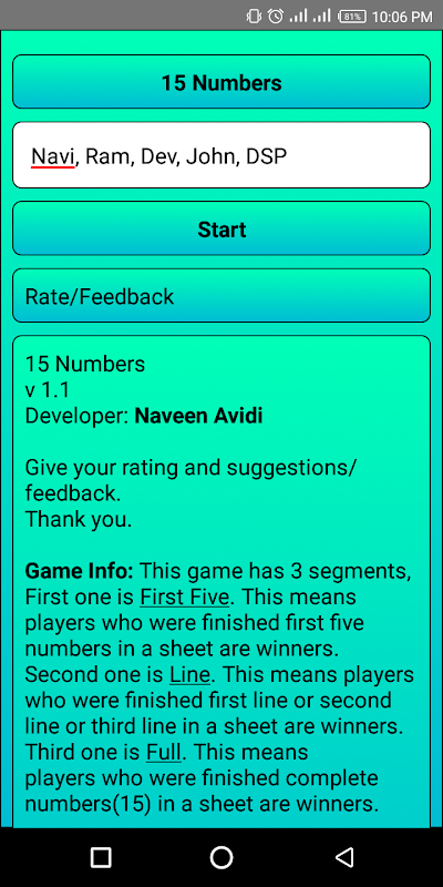 In this game each sheet will allocate for each player. And each sheet contains 15 numbers. A dice is placed on top of the sheets. There are 90 numbers (1-90) in the dice. When you clicked on the dice, the result number will be checked throwout the players sheets whether that number is in his/her sheet. If found white color applied to the number in the sheet. In this way who completes the complete sheet are winners. More info can be found in game's main screen.