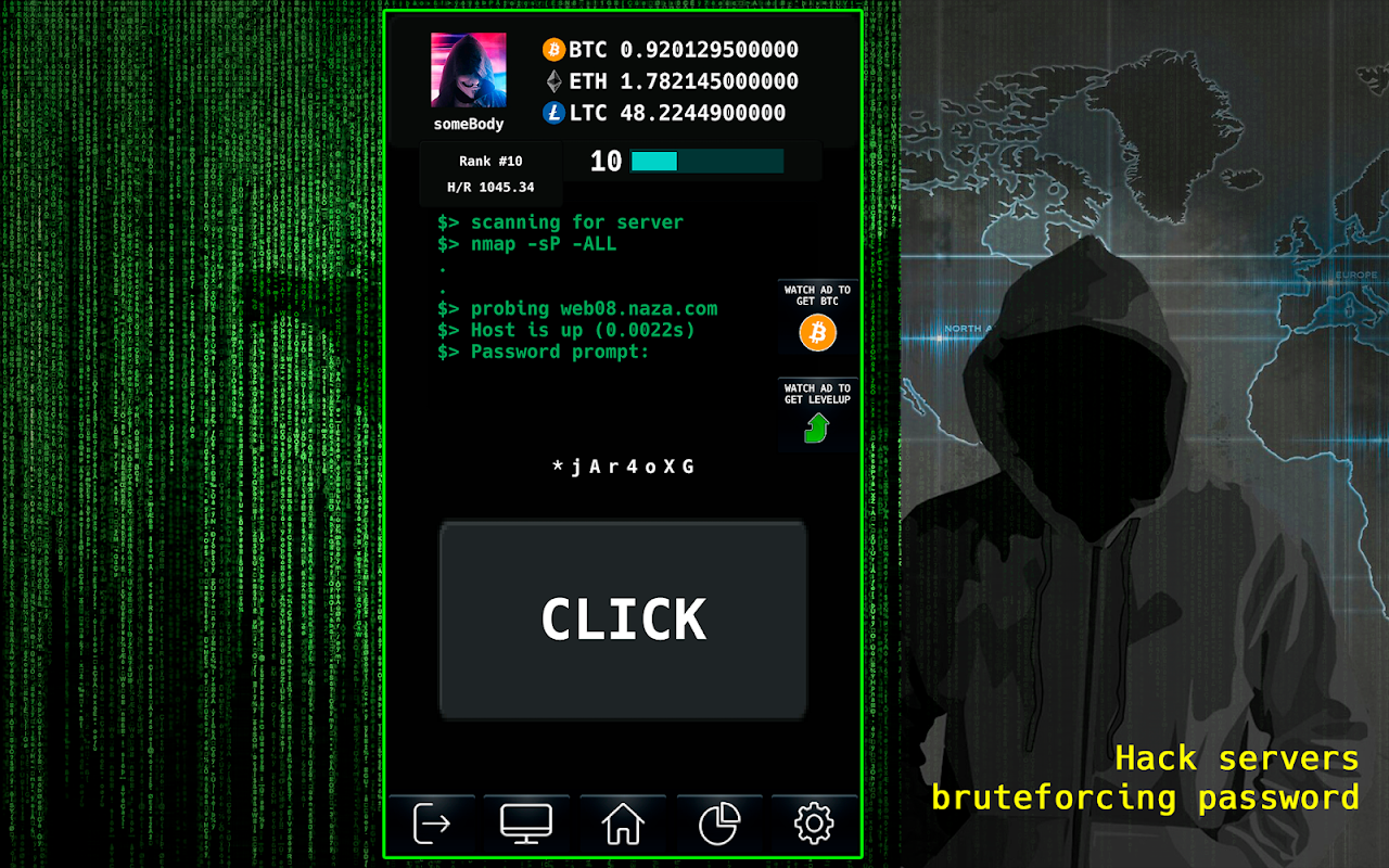 হ্যাকিং এবং ক্রিপ্টোমাইনিং থিম সহ একটি ওয়ান-বাটন ক্লিকার খেলা।