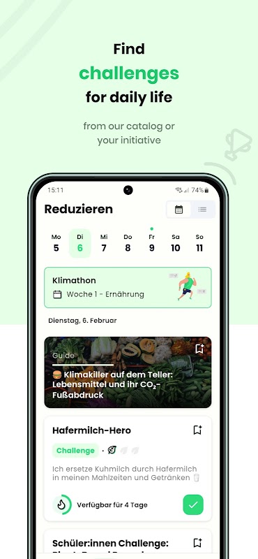 160 টিরও বেশি জলবায়ু চ্যালেঞ্জ দৈনন্দিন জীবনের বিভিন্ন বিষয়গুলিতে ফোকাস করে৷ একটি চ্যালেঞ্জ সম্পূর্ণ করার জন্য আপনি মূল্যবান জলবায়ু পয়েন্ট পাবেন। অবশ্যই, সমস্ত চ্যালেঞ্জের মধ্যে বিশদ তথ্যের পাঠ্য রয়েছে যা চ্যালেঞ্জের পরিস্থিতি এবং প্রভাব বিস্তারিতভাবে ব্যাখ্যা করে। Worldwatchers, Frauenhofer.iee, Wuppertal ইনস্টিটিউট এবং ক্যাসেল বিশ্ববিদ্যালয়ের সাথে সহযোগিতার জন্য ডেটা সর্বদা আপ টু ডেট থাকে।