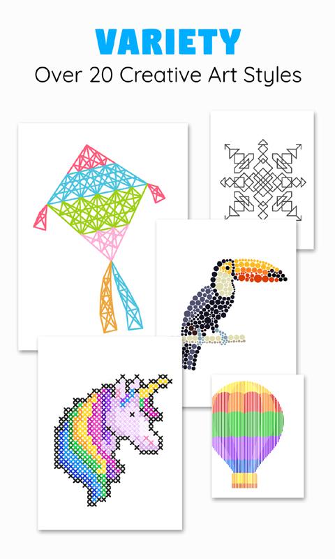 সুন্দর নিদর্শন এবং বস্তু গঠনের জন্য রঙিন থ্রেডে যোগ দিন। আঁকার জন্য 15 টিরও বেশি বস্তু রয়েছে।