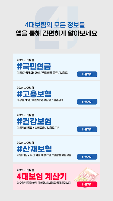 চারটি প্রধান বীমা ব্যবস্থা সামাজিক ঝুঁকির প্রস্তুতির জন্য নাগরিকদের একটি স্থিতিশীল জীবন নিশ্চিত করে। 4টি প্রধান বীমা অ্যাপে, আমরা 4টি প্রধান বীমাকে সংগঠিত করেছি, যেগুলি জটিল এবং কঠিন, এক নজরে সহজেই দেখতে পাওয়া যায়৷