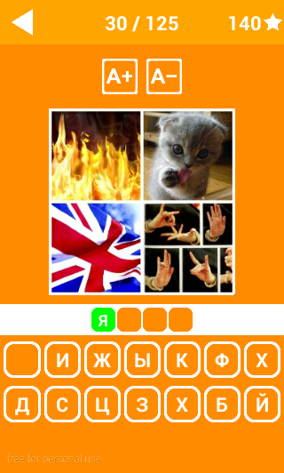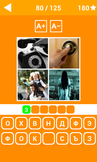 4 фото 1 слово - логическая игра-викторина для любителей интеллектуальных головоломок. Игра носит развлекательный характер, но и заставляет работать мозг. Ваша задача - угадать слово объединяющее 4 разных фото на экране, а затем составить это слово из заданного набора букв. В игре 5 уровней сложности, содержащих более 120 слов-загадок. Если в процессе разгадывания возникли сложности вы всегда можете воспользоваться двумя подсказками - удалить лишние буквы или открыть правильную букву. За подсказки снимаются баллы, за правильные ответы начисляются. 4 фото 1 слово - хороший способ проверить уровень ваших знаний, интеллекта и абстрактности мышления. Вам точно не будет скучно!