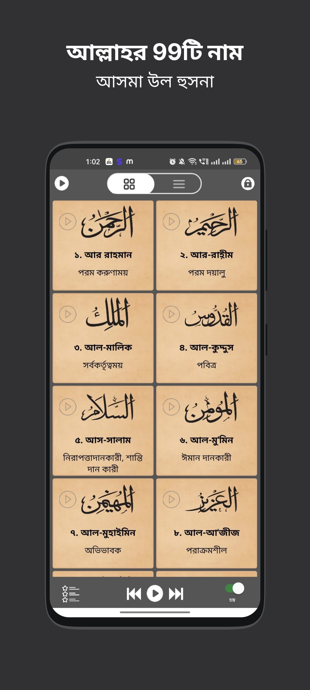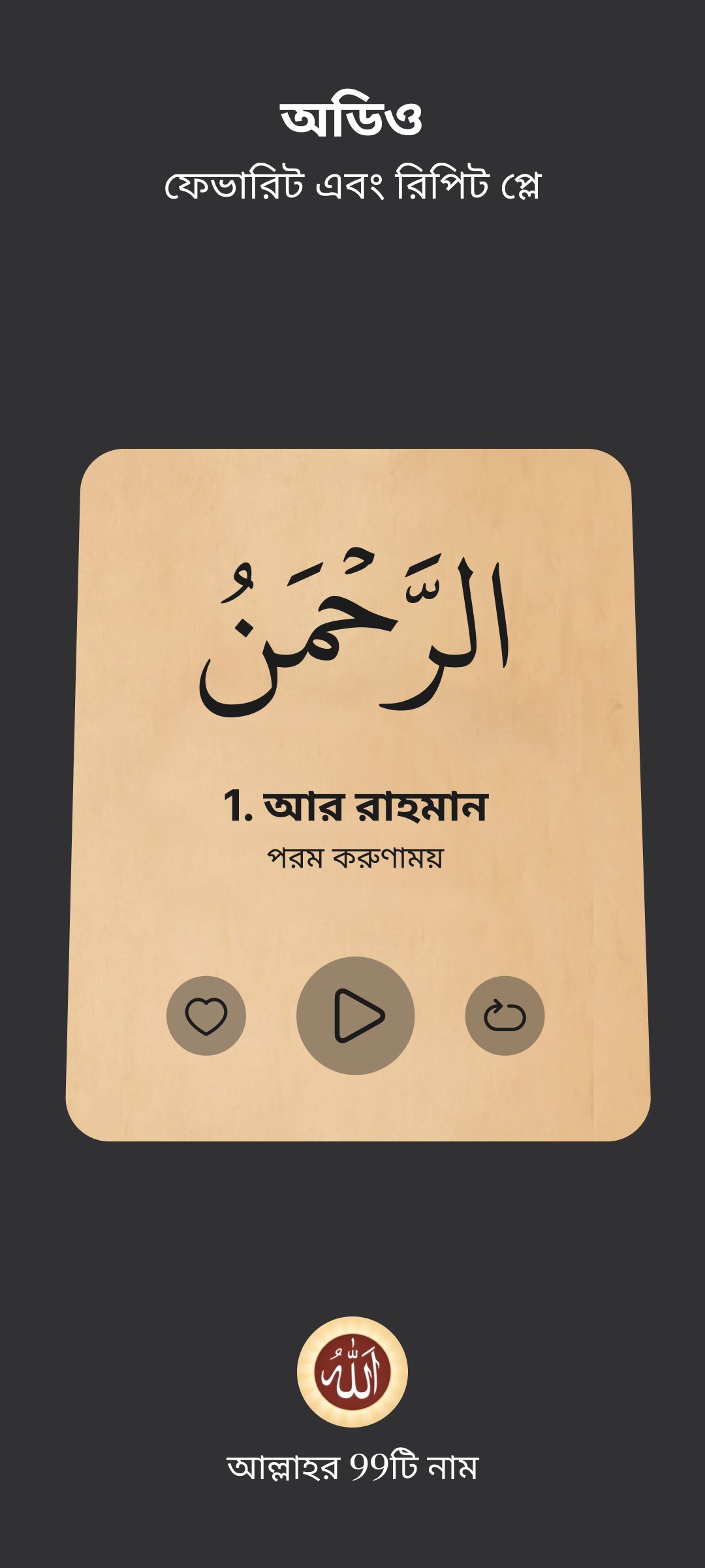 - অডিও উচ্চারণ: প্রতিটি নামের অডিও পৃথকভাবে শুনুন অথবা সবগুলি সিরিজ আকারে শুনুন। প্লে, পজ, রিওয়াইন্ড এবং ফরোয়ার্ড অপশনগুলির মাধ্যমে প্লেব্যাক নিয়ন্ত্রণ করুন।