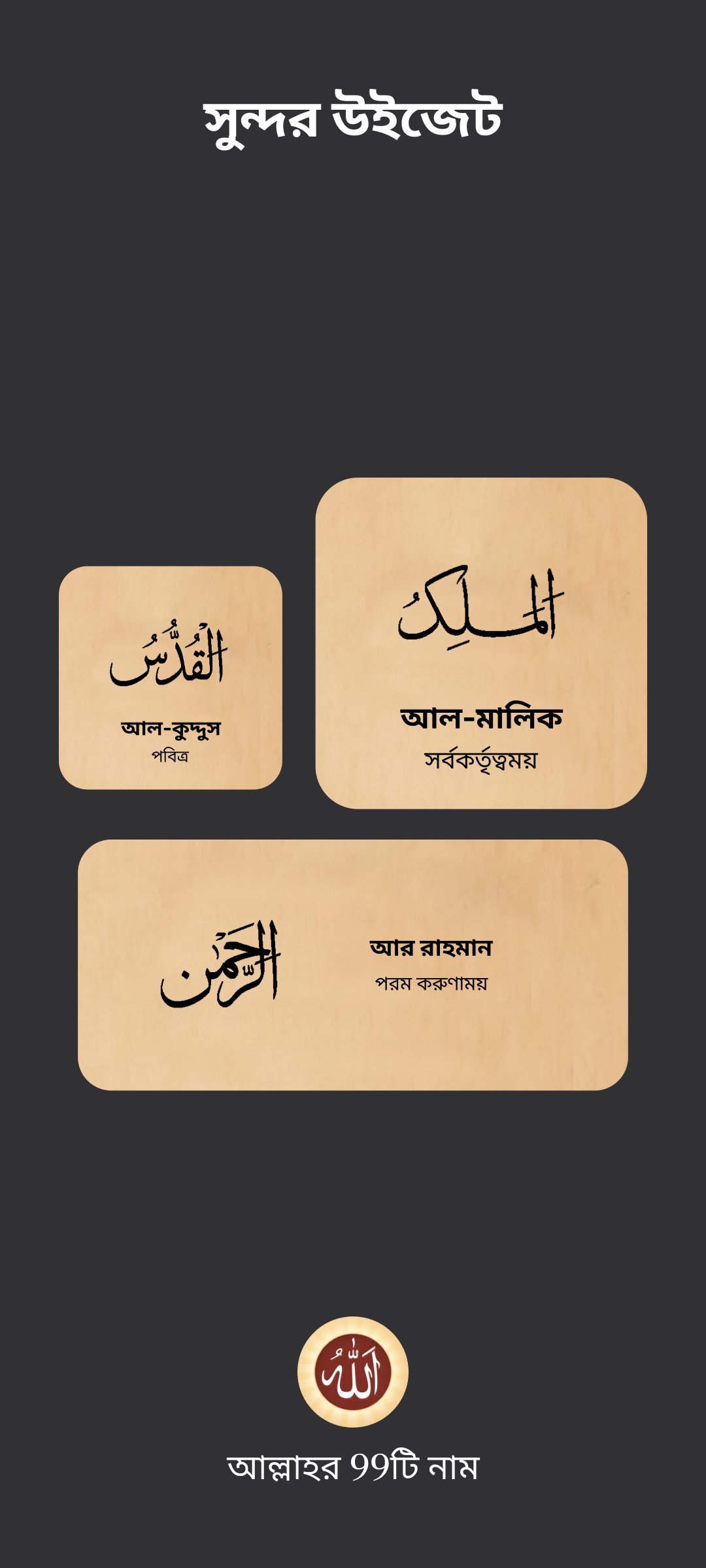 - উইজেট: হোম স্ক্রিনে উইজেট ইনস্টল করুন যাতে আপনি দ্রুত আল্লাহর ৯৯ নাম এবং তসবিহ গণনাকারীতে প্রবেশ করতে পারেন।