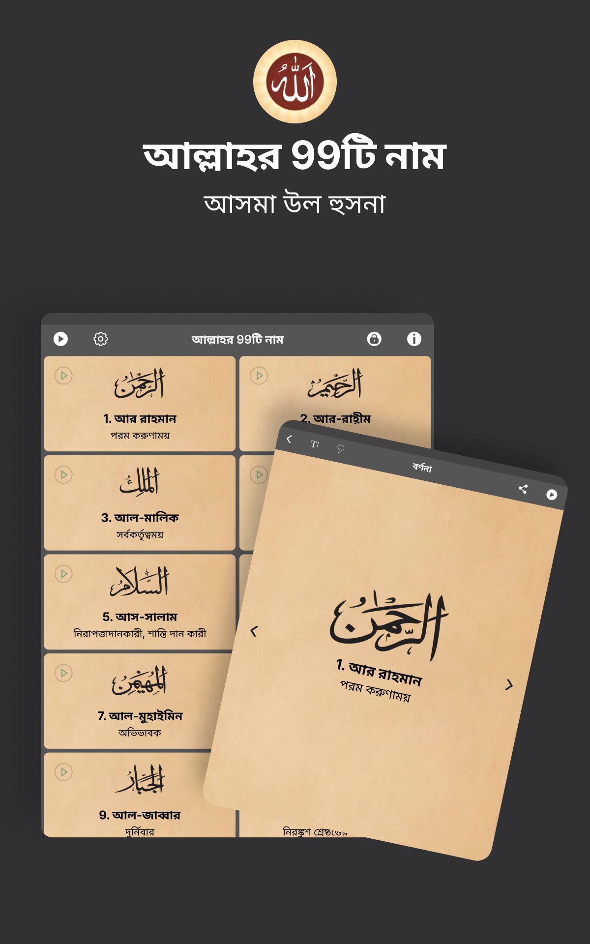 আমাদের সম্পূর্ণ অ্যাপের মাধ্যমে আল্লাহর ৯৯ নামের সৌন্দর্য ও অর্থ আবিষ্কার করুন, যা আপনাকে সর্বশক্তিমান আল্লাহর সাথে আপনার সম্পর্ক গভীর করার জন্য ডিজাইন করা হয়েছে। এই ইসলামিক অ্যাপটি সারা বিশ্বের মুসলমানদের জন্য অত্যন্ত প্রয়োজনীয়, যা আপনাকে আল্লাহর ৯৯ নাম অর্থসহ পড়তে ও শুনতে সাহায্য করে।
