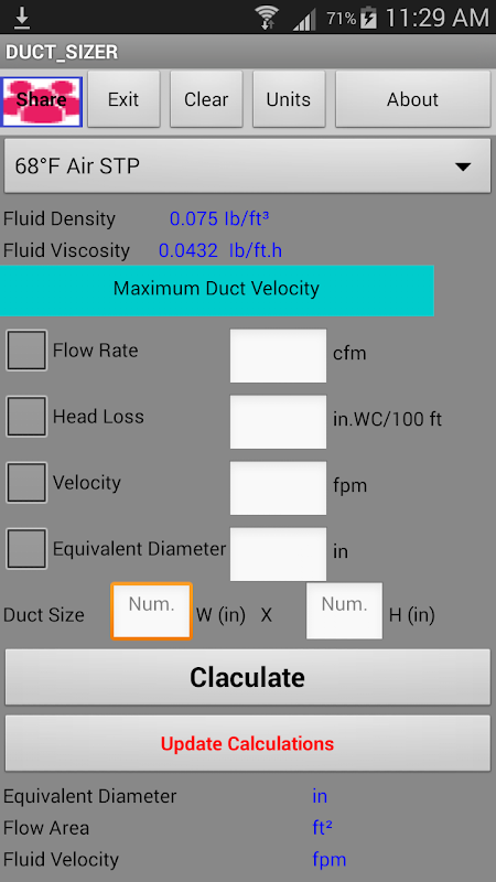 ডাক্ট মানদণ্ড: আপনি আপনার নালী Design.You কিভাবে এই অ্যাপ্লিকেশন ব্যবহার বর্ণনা ব্যবহার করতে পারেন সম্পূর্ণ করতে প্রয়োজনীয় সব তথ্য পেতে পারেন দুই ইনপুট প্রবেশ হুঁশিয়ার হত্তয়া সহজ এবং দ্রুত উপায় আপনার সর্বোচ্চ বেগ চেক করতে পারেন. বাটন সম্পর্কে সংবাদ তারপর USE.YOU বর্ণনা আপনি চাপ মাথা ক্ষতি এবং বেগ পরিবর্তন দেখতে আপনি পারবেন যোগ নালী পরিবর্তন উচ্চতা মত OTHERS.IF পেতে কোনো দুটি ভেরিয়েবল (প্রবাহ হার, বেগ, মাথা ক্ষতি ও সমমানের ব্যাস) মধ্যে পরিবর্তন করতে পারেন সংবাদ আপডেট গণনা বাটন.